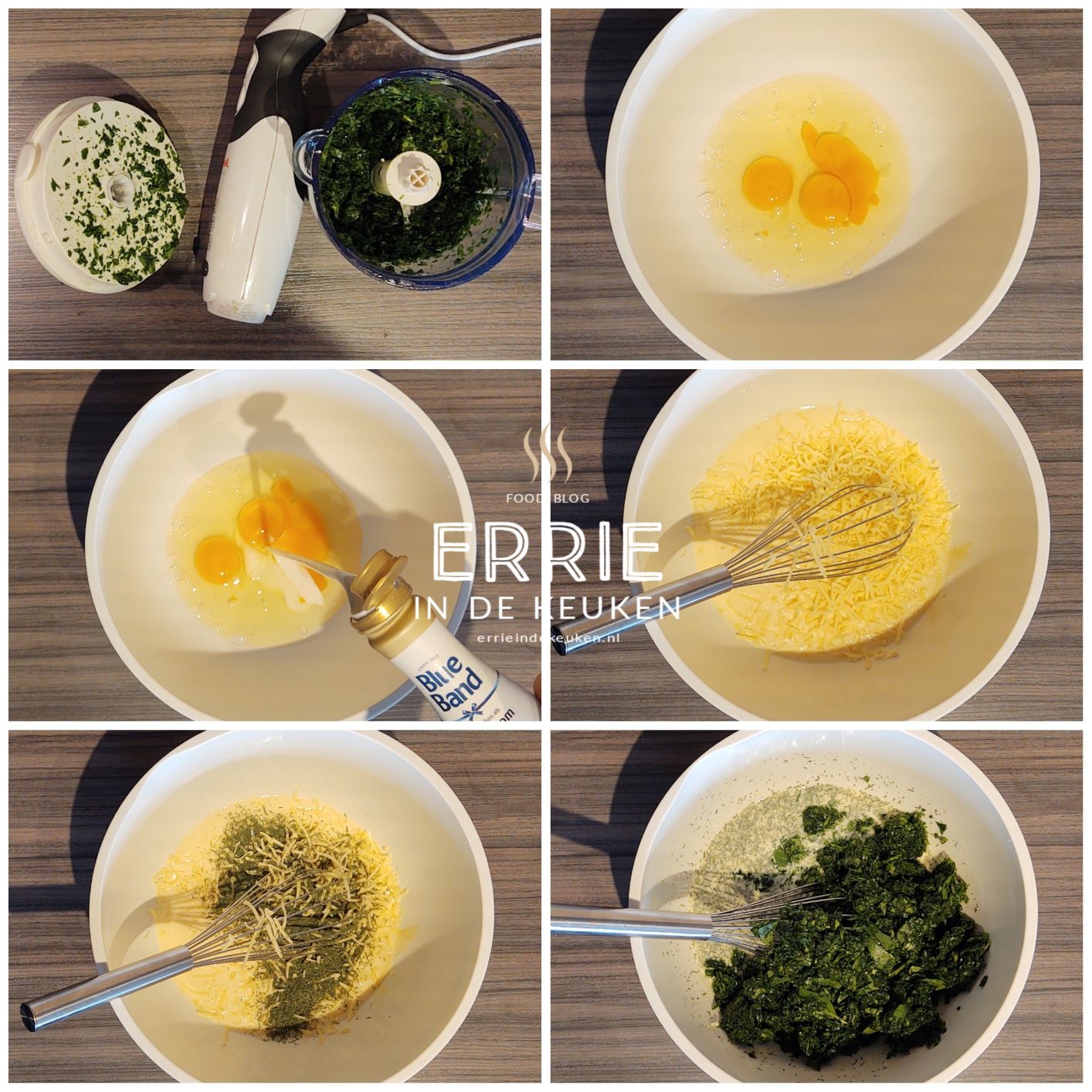 Start by slicing the spinach in a food processor and set it aside. Put the three eggs and the cream in a bowl and mix well. Then add the cheese, dill, pepper and salt (to taste) and mix together. Now you can add the spinach and make sure it looks good.