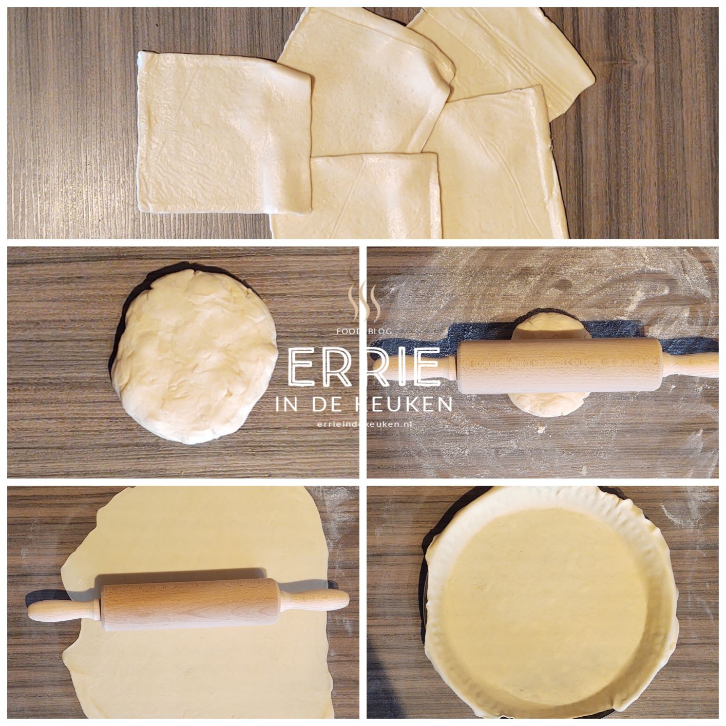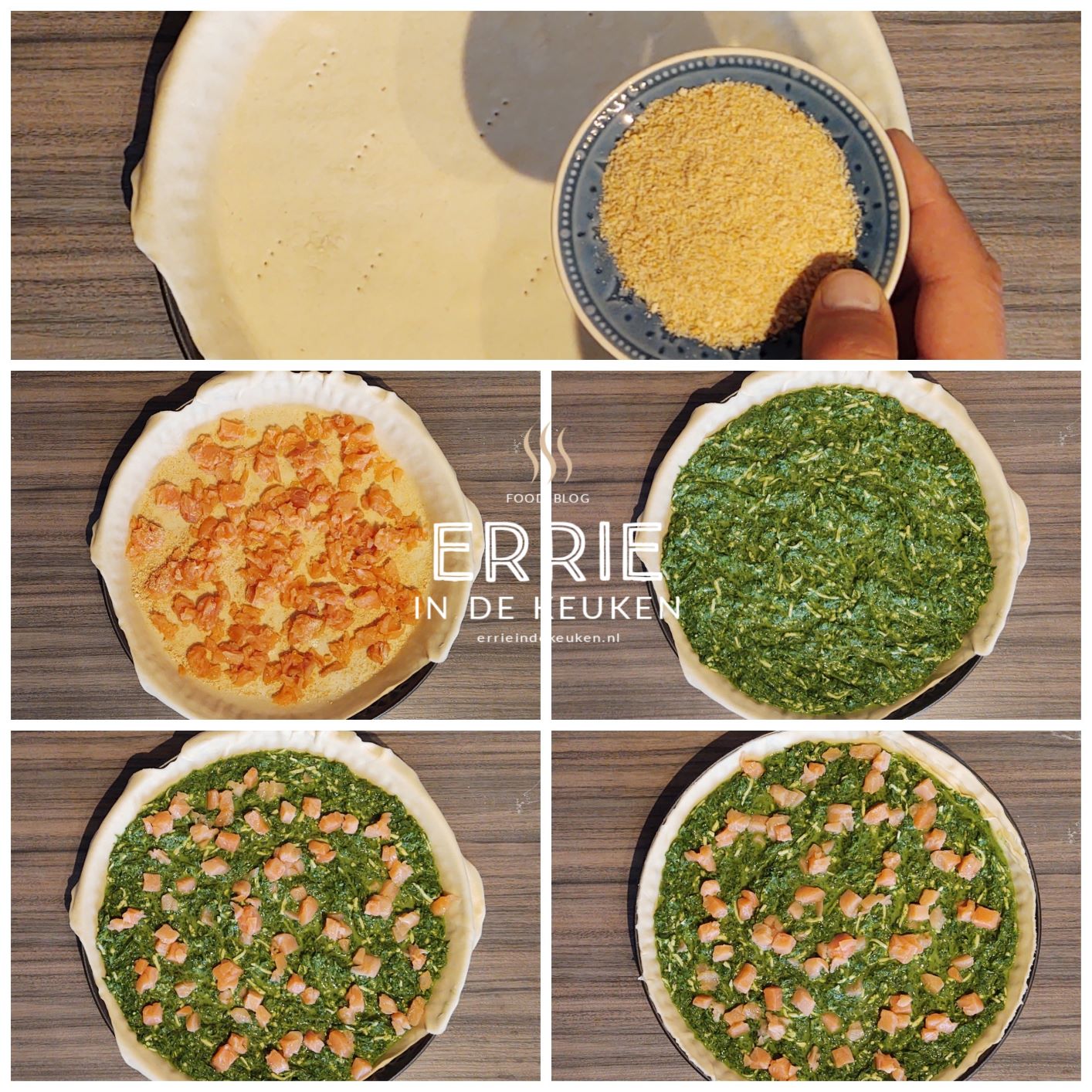 Prick some holes in the dough bottom and sprinkle the breadcrumbs over this bottom. Also spread the salmon chips over it so that it is well distributed. now the egg-spinach mixture can also be poured over it, also make sure that it is well distributed. Finally, the salmon cubes must now be distributed over the mixture. Finally, cut away the dough hanging over the edge.